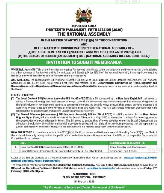 The Bill is currently before the Departmental Committee on Trade, Industry and Cooperatives following its First Reading. In line with Article 118(1)(b) of the Constitution, members of the public are invited to submit their views.